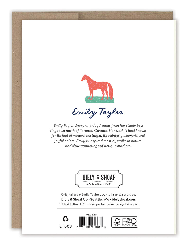 About the artist: Emily Taylor draws and daydreams from her studio in a tiny town north of Toronto, Canada. Her work is best known for its feel of modern nostalgia, its painterly linework and joyful colors. Emily is inspired most by walks in nature and slow wanderings of antique markets.