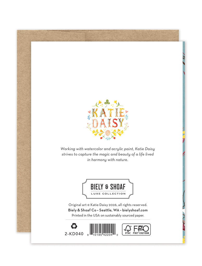 About the artist: Katie Daisy was raised by the birds and warm breezes of small-town Lindenwood, Illinois, brought up among the wildflowers with roots planted deeply in the natural world. Working in watercolor and acrylic paint, Katie strives to capture the magic and beauty of a life lived in harmony with nature.
