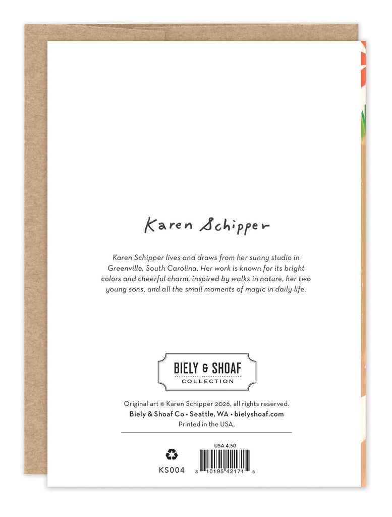 About the artist: Karen Schipper lives and draws from her sunny studio in Greenville, South Carolina. Her work is known for its bright colors and cheerful charm, inspired by walks in nature, her two young sons, and all the small moments of magic in daily life.