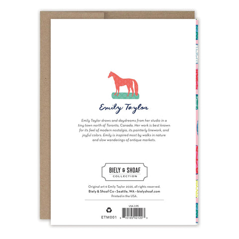 About the artist: Emily Taylor draws and daydreams from her studio in a tiny town north of Toronto, Canada. Her work is best known for its feel of modern nostalgia, its painterly linework and joyful colors. Emily is inspired most by walks in nature and slow wanderings of antique markets.