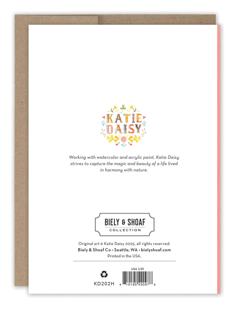 About the artist: Katie Daisy was raised by the birds and warm breezes of small-town Lindenwood, Illinois, brought up among the wildflowers with roots planted deeply in the natural world. Working in watercolor and acrylic paint, Katie strives to capture the magic and beauty of a life lived in harmony with nature.