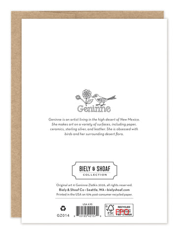 About the artist: Geninne is an artist living in the high desert of New Mexico. She makes art on a variety of surfaces, including ceramics and sterling silver. She is obsessed with birds and her surrounding desert flora.