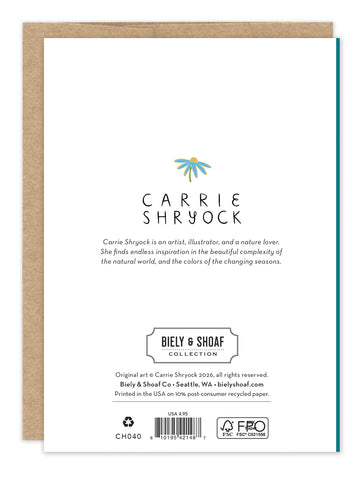 About the artist: Carrie Shryock is an artist, illustrator, and a nature lover. She grew up on a farm in the heart of the Midwest, where she spent her childhood picking bouquets of wildflowers and exploring the wide-open prairie under a big cloud filled sky. She finds endless inspiration in the beautiful complexity of the natural world, and the colors of the changing seasons. A former elementary school art teacher, Carrie now works full time as an illustrator, utilizing a variety of media, both traditional and digital. She works from her home studio in Columbia, Missouri.