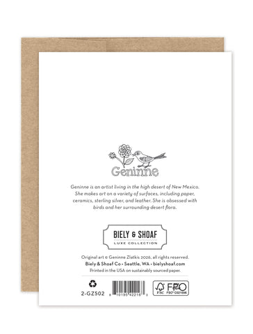 About the artist: Geninne is an artist living in the high desert of New Mexico. She makes art on a variety of surfaces, including ceramics and sterling silver. She is obsessed with birds and her surrounding desert flora.