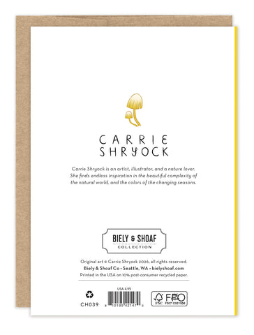 About the artist: Carrie Shryock is an artist, illustrator, and a nature lover. She grew up on a farm in the heart of the Midwest, where she spent her childhood picking bouquets of wildflowers and exploring the wide-open prairie under a big cloud filled sky. She finds endless inspiration in the beautiful complexity of the natural world, and the colors of the changing seasons. A former elementary school art teacher, Carrie now works full time as an illustrator, utilizing a variety of media, both traditional and digital. She works from her home studio in Columbia, Missouri.