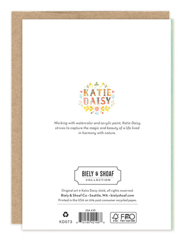 About the artist: Katie Daisy was raised by the birds and warm breezes of small-town Lindenwood, Illinois, brought up among the wildflowers with roots planted deeply in the natural world. Working in watercolor and acrylic paint, Katie strives to capture the magic and beauty of a life lived in harmony with nature.