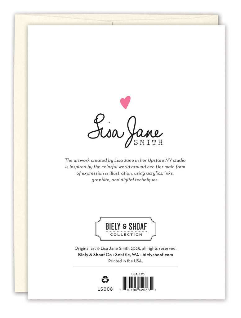 About the artist: The artwork created by Lisa Jane in her Upstate New York studio is inspired by the colorful world around her. Her main form of expression is illustration, using acrylics, inks, graphite, and digital techniques.