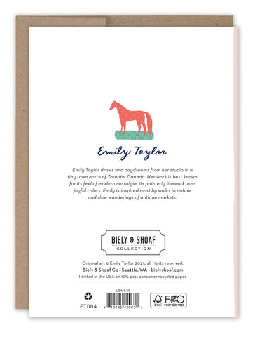 About the artist: Emily Taylor draws and daydreams from her studio in a tiny town north of Toronto, Canada. Her work is best known for its feel of modern nostalgia, its painterly linework and joyful colors. Emily is inspired most by walks in nature and slow wanderings of antique markets.