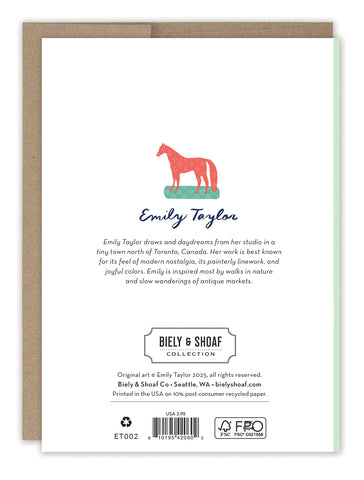 About the artist: Emily Taylor draws and daydreams from her studio in a tiny town north of Toronto, Canada. Her work is best known for its feel of modern nostalgia, its painterly linework and joyful colors. Emily is inspired most by walks in nature and slow wanderings of antique markets.
