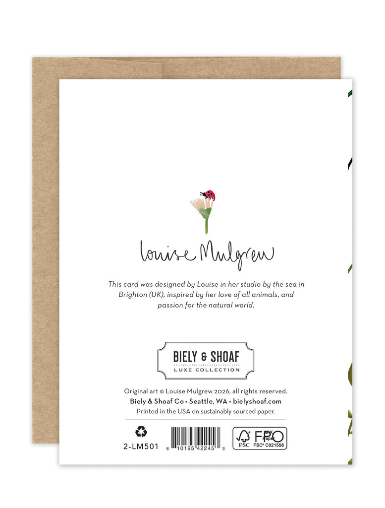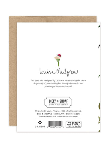 About the artist: Working with gouache and watercolor, Louise designs in her tiny studio in Brighton, England, inspired by her love of all animals, and passion for the natural world. Louise was named 2023 Artist of the Year by the USA Greeting Card Association.