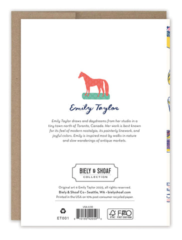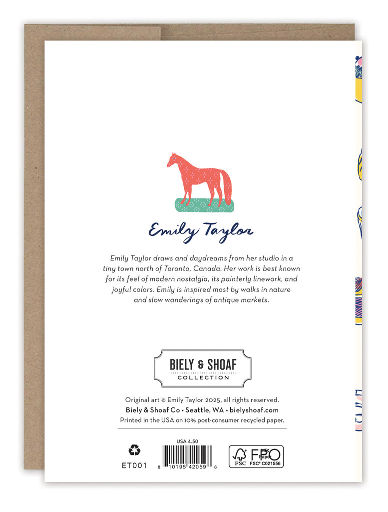 About the artist: Emily Taylor draws and daydreams from her studio in a tiny town north of Toronto, Canada. Her work is best known for its feel of modern nostalgia, its painterly linework and joyful colors. Emily is inspired most by walks in nature and slow wanderings of antique markets.